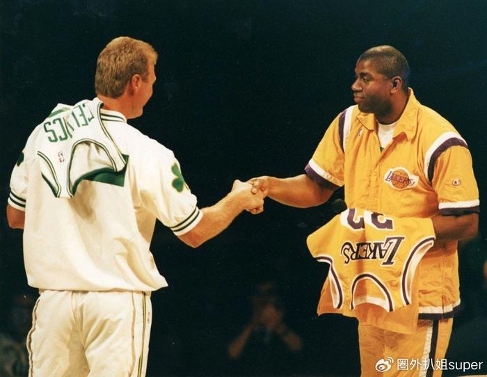 拉里伯德球衣退役仪式上和魔术师互换球衣