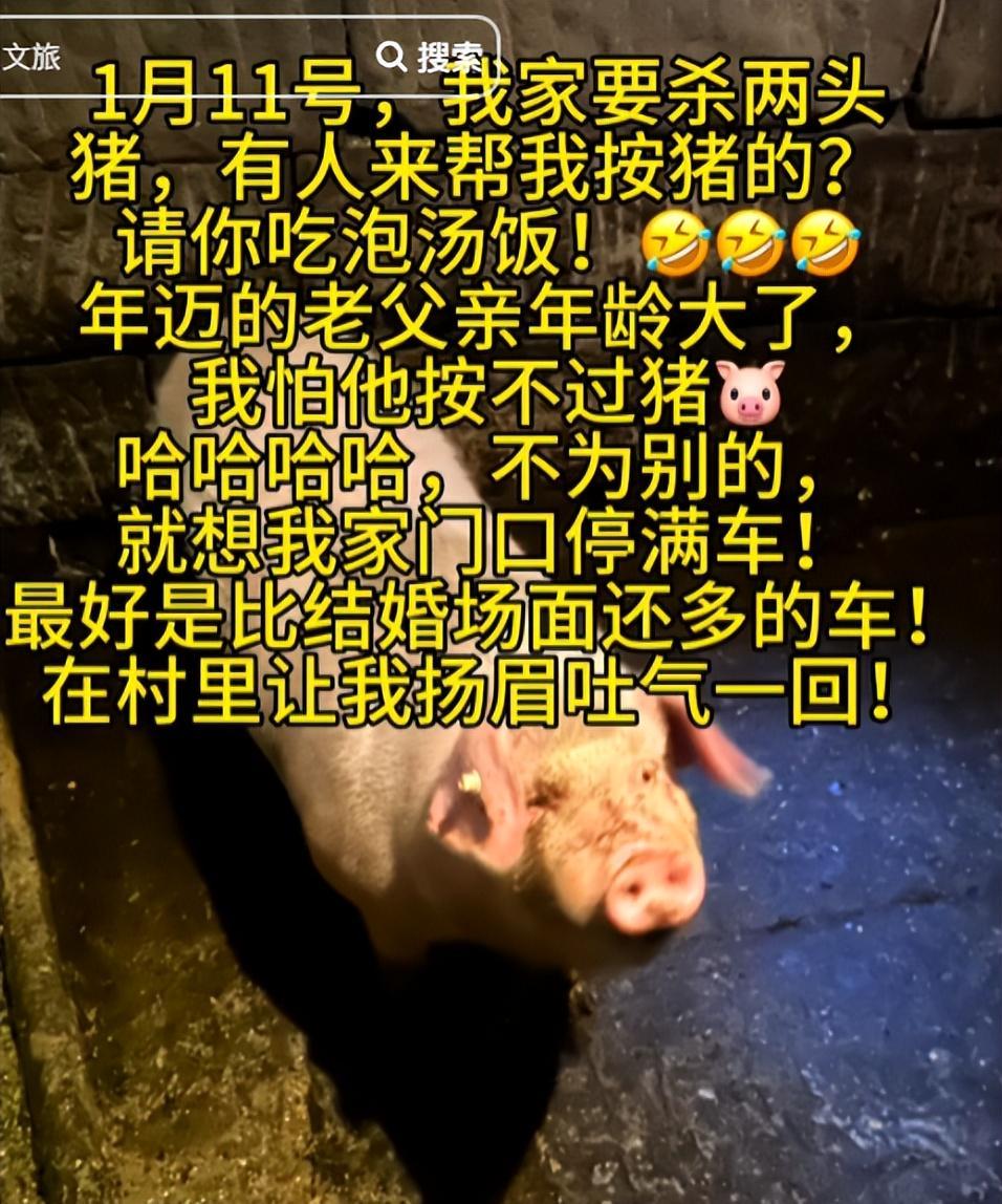 “1月11日,我家要杀两头猪,有人来帮我按猪吗?请你吃刨猪汤!父亲年龄大了,怕他按不过猪。”