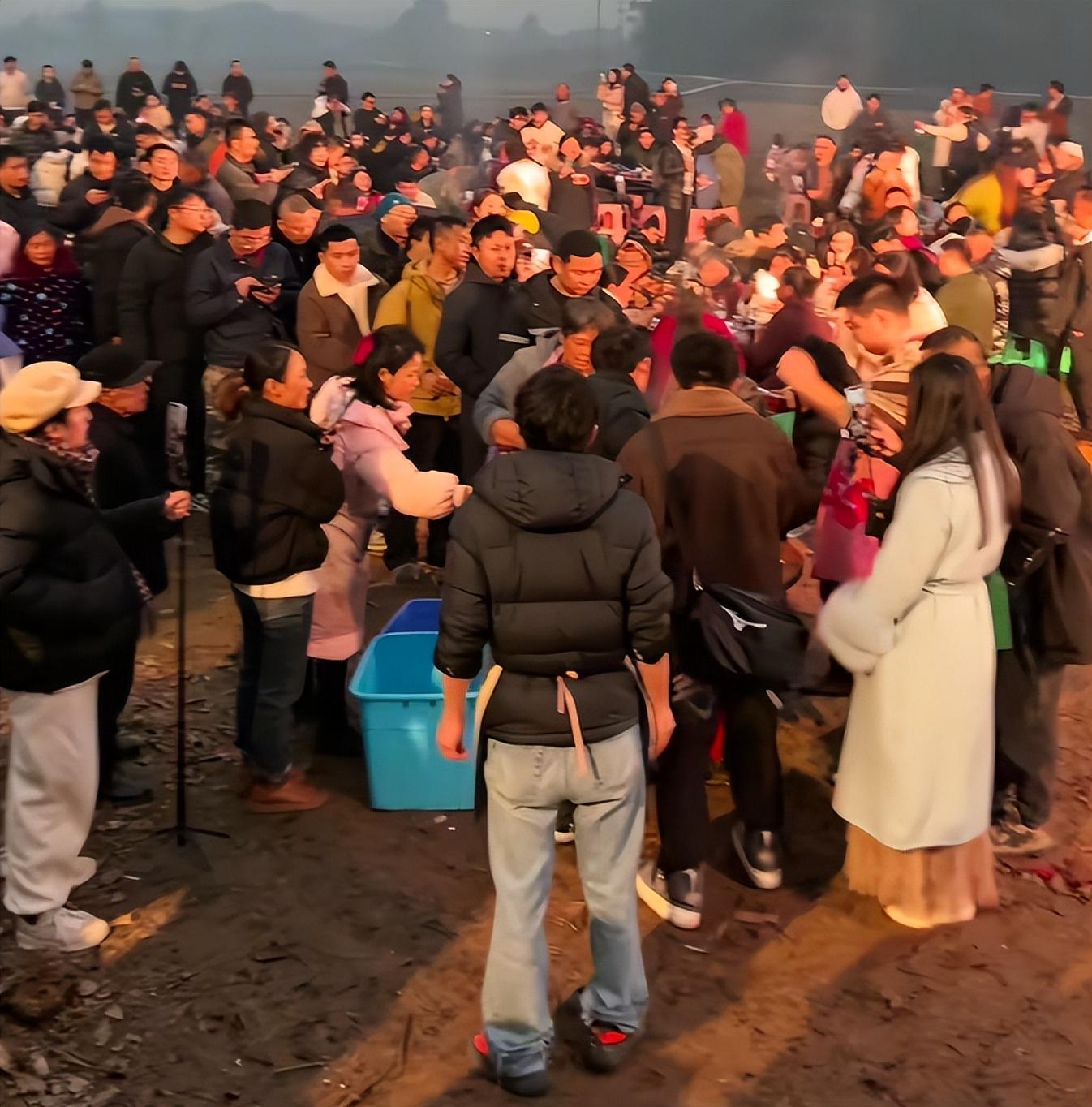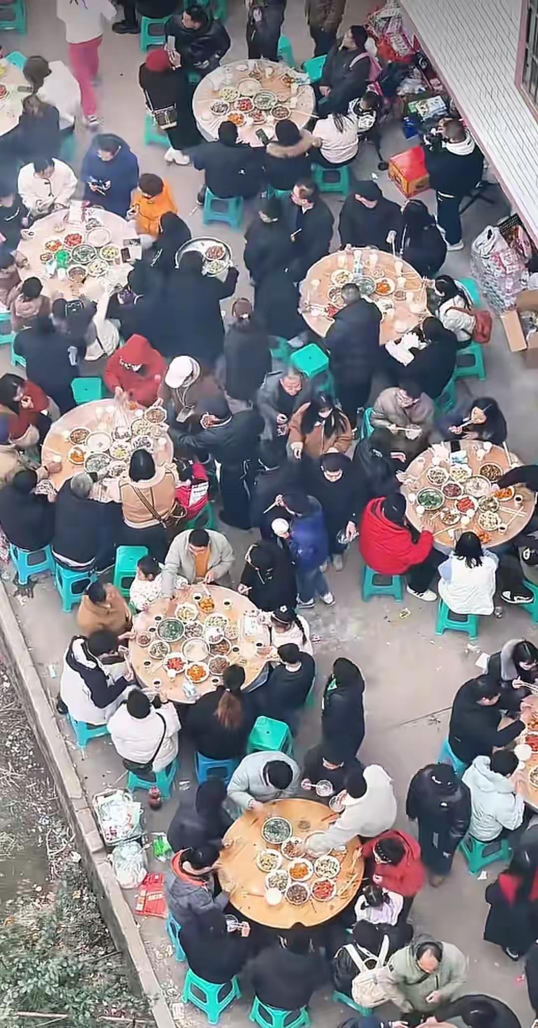 现场彻底变成了大型民俗嘉年华,院子里摆不下桌椅,就在门口的田埂上摆,碗筷不够,一次性餐具成箱成箱地搬,厨师忙不过来,自称做过厨子的网友直接系上围裙进厨房掌勺。